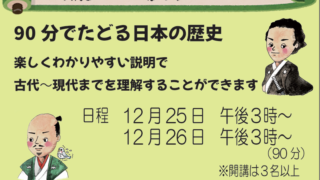 12月25日と26日に受験生および歴史好きの方向けの日本の歴史講座を行う予定です。つきましては受講希望者を募集しておりますのでぜひお問い合わせをお待ちしております。