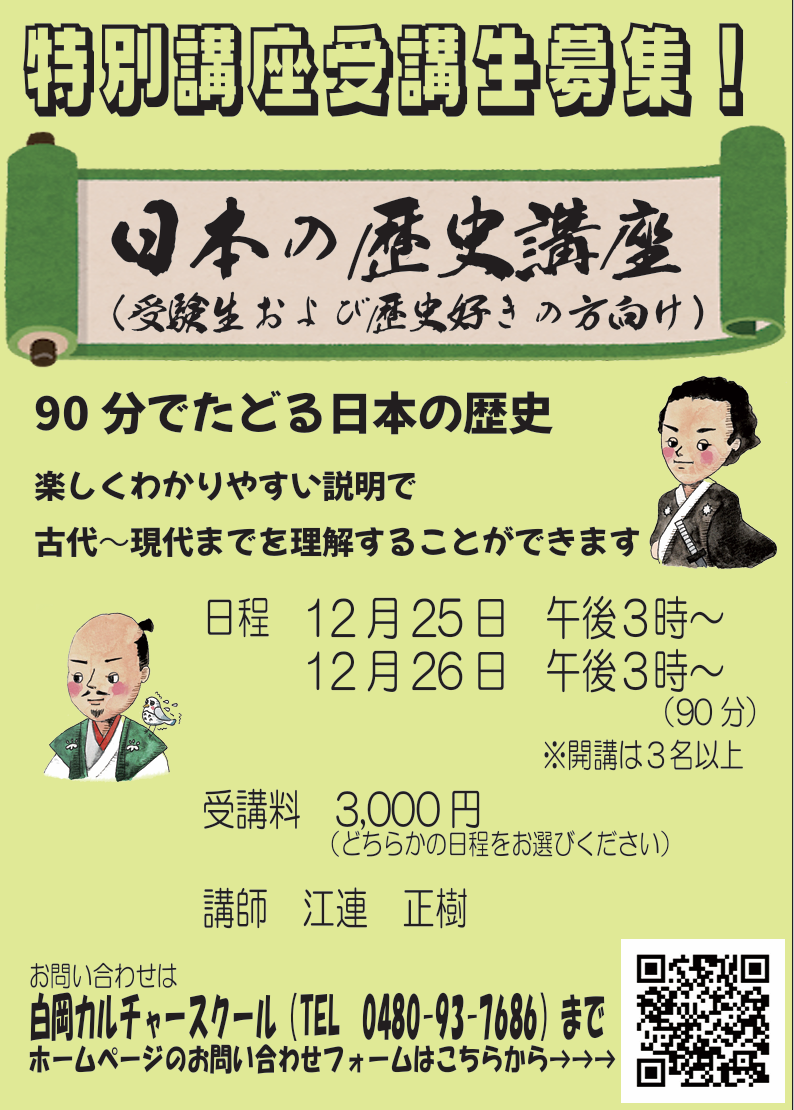 特別講座のご案内 ~日本の歴史~ 講座案内 2025.12.09 12月25日と26日に受験生および歴史好きの方向けの日本の歴史講座を行う予定です。つきましては受講希望者を募集しておりますのでぜひお問い合わせをお待ちしております。